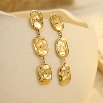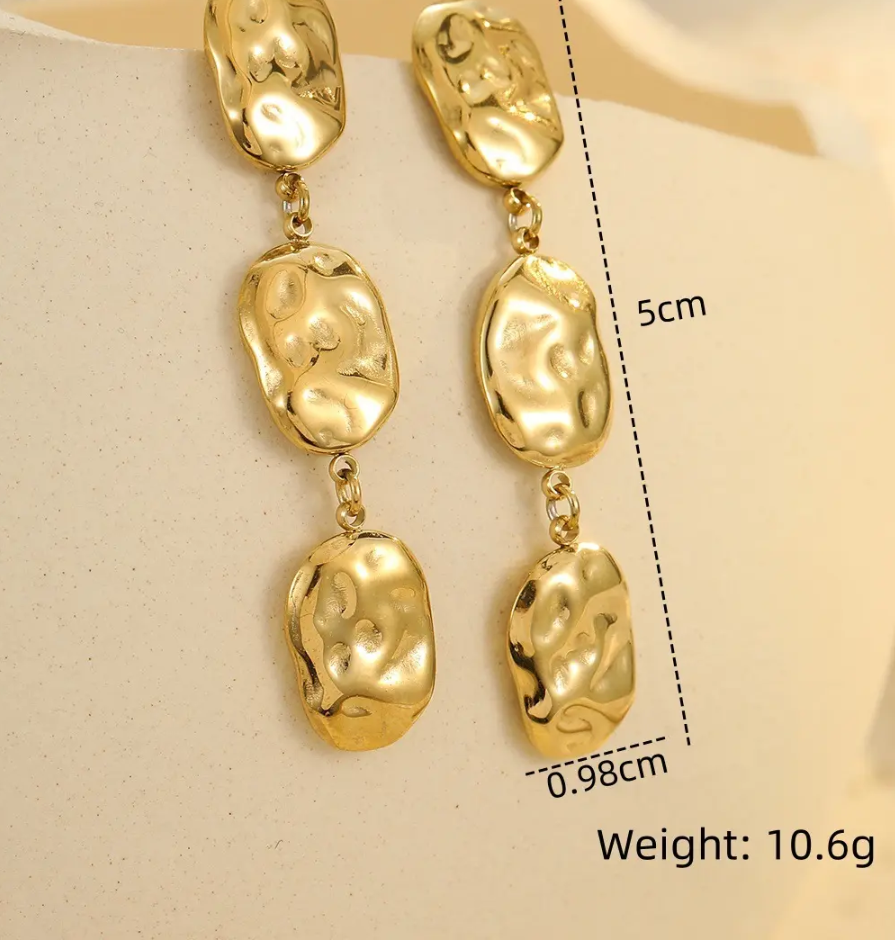 Hammered oval pendant earrings. Available in gold or silver.