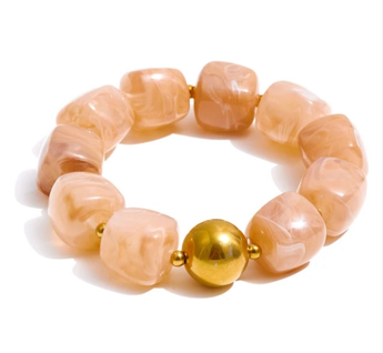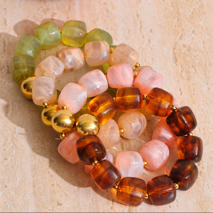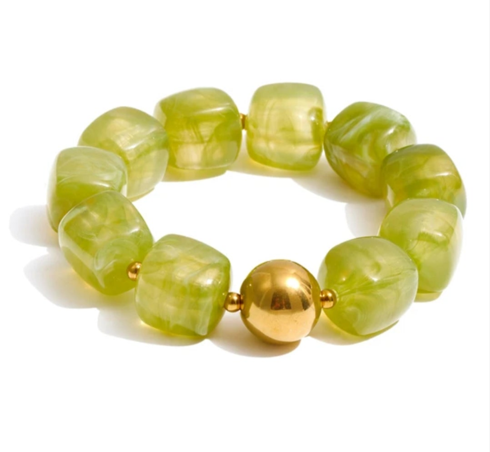 Acrylic chunky stretch beaded bracelet. Available in beige, green and tortoiseshell. Matching necklace available.